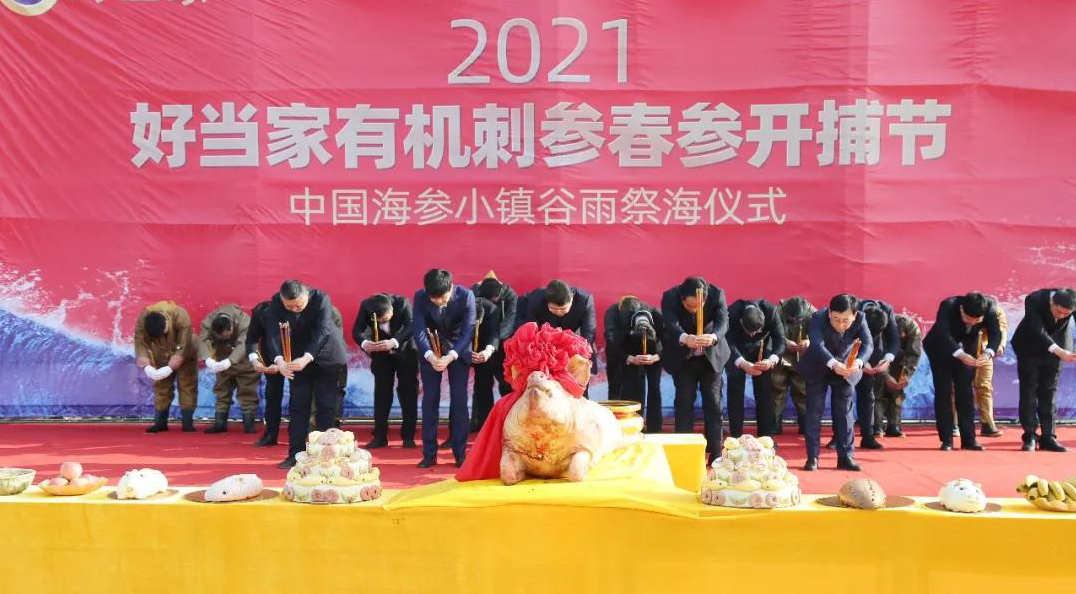 “谷雨時節,百魚上岸”,北方沿海漁民們會在谷雨這天舉行盛大的儀式,虔誠向大海獻祭,祈禱平安與豐收。谷雨祭海也被稱為“漁民開洋、謝洋節”,是國家級非物質文化遺產之一。4月20日谷雨當天,好當家在天海灣海洋牧場舉行了隆重“”2021年好當家有機刺參春參開捕節暨中國海參小鎮谷雨祭海儀式,由此,2021好當家春季海參捕撈全面開啟。